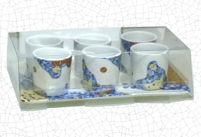 Medidas envase: 20.5 x 14 x 5.5 cm Chupito: 4,5 cm diámetro x 4,5 cm altura Bandeja: 20 x 13 cm.